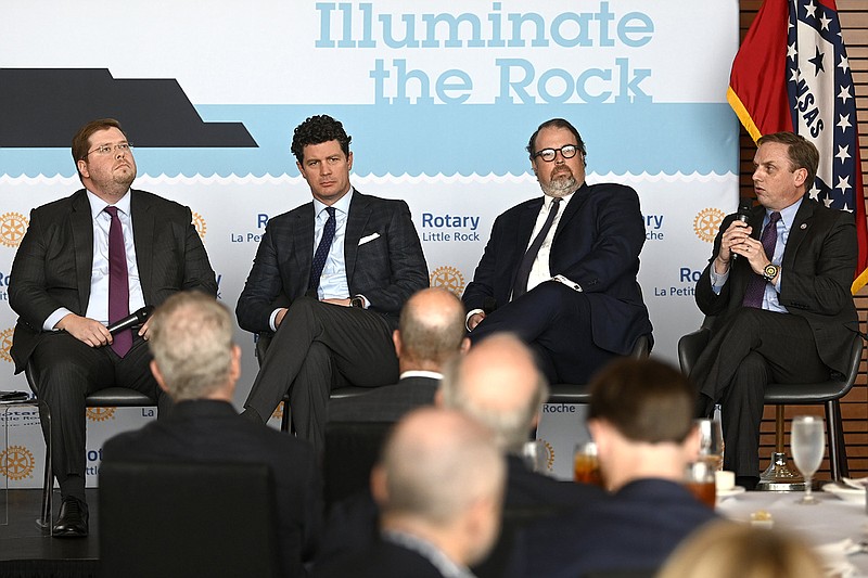 Caption for photo: (From left) Lobbyists Jon Gilmore and Blake Eddins sit on stage alongside Sarah Huckabee Sanders campaign manager Chris Caldwell and Incoming House Speaker Matthew Shepherd during a meeting of the Rotary Club at the Clinton Library on Tuesday, Jan. 3, 2023. (Arkansas Democrat-Gazette/Stephen Swofford)